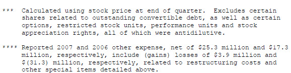 Free cash flow in the second quarter of 2007 was $204.0 million as compared to $0.8 million in the second quarter of 2006. The improvement reflects primarily the improvement in earnings and lower capital spending. (Net cash provided by operating activities was $289.3 million in the second quarter of 2007 as compared to $74.8 million in the second quarter of 2006. A reconciliation of free cash flow to net cash provided by operating activities is provided in the supplemental data pages.)