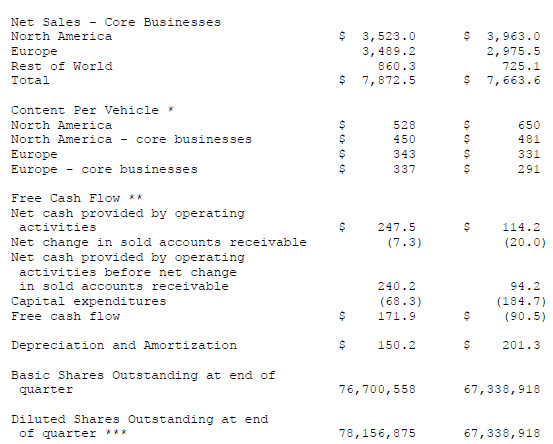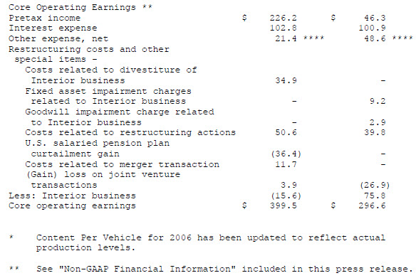 In addition to the results reported in accordance with accounting principles generally accepted in the United States ("GAAP") included throughout this press release, the Company has provided information regarding "seating and electrical and electronic income before interest, other expense, income taxes, restructuring costs and other special items" (core operating earnings), "pretax income before restructuring costs and other special items" and "free cash flow" (each, a non-GAAP financial measure). Other expense includes, among other things, state and local non-income taxes, foreign exchange gains and losses, fees associated with the Company's asset-backed securitization and factoring facilities, minority interests in consolidated subsidiaries, equity in net income of affiliates and gains and losses on the sale of assets. Free cash flow represents net cash provided by operating activities before the net change in sold accounts receivable, less capital expenditures. The Company believes it is appropriate to exclude the net change in sold accounts receivable in the calculation of free cash flow since the sale of receivables may be viewed as a substitute for borrowing activity.