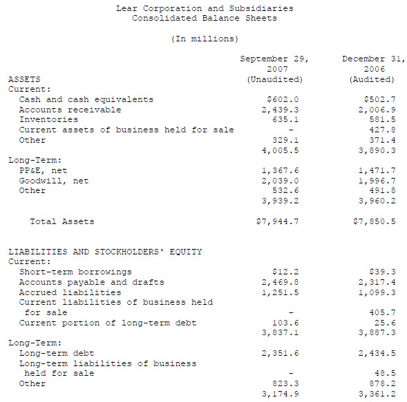 For the third quarter of 2007, Lear reported net sales of $3.6 billion and pretax income of $60.1 million, including restructuring costs of $37.3 million and other special items of $8.0 million. For the third quarter of 2006, Lear reported net sales of $4.1 billion and a pretax loss of $65.9 million, including restructuring costs and other special items of $46.1 million.